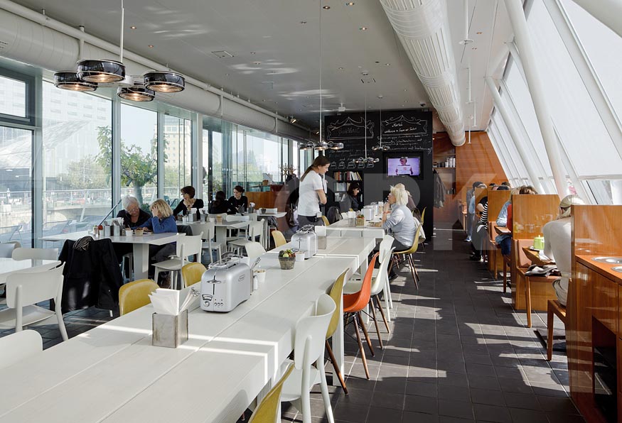 Gleich wenn man hinein kommt, begrüßt und verweist der Supervisor einen an den Tisch, der Raum ist durch die großen Wandfenster mit Licht durchflutet.